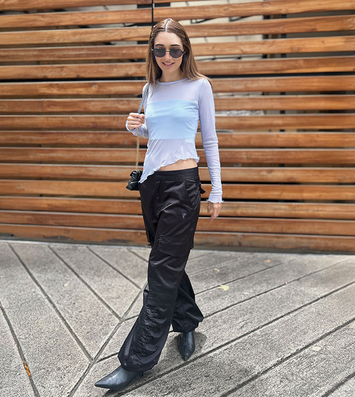 Blusa ajustada diagonal con terminacion en punta, tejido de punto licrada, cuello cerrado y manga larga. La blusa incluye el top interno. Prenda apta para clima cálido o frio. Manufactura 100% Colombiana.