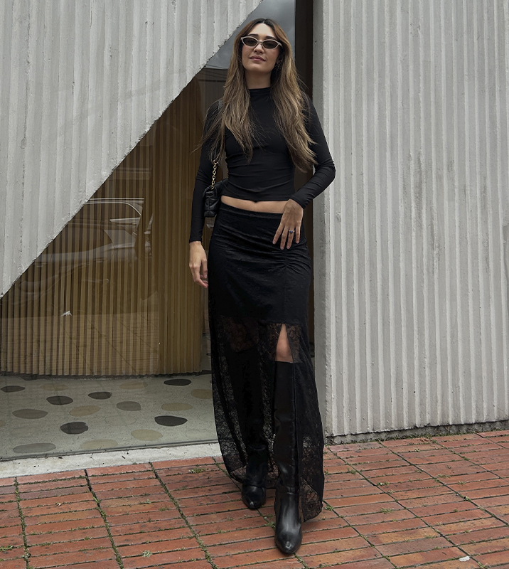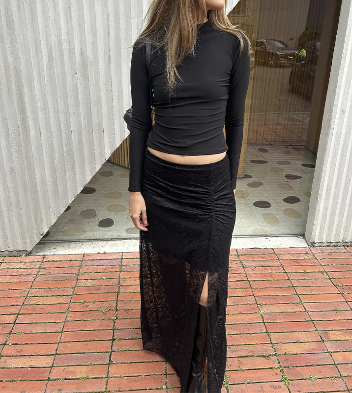 Falda larga confeccionada en tejido elástico de encaje con forro interno (el forro está unido a la falda). Como detalle, cuenta con una abertura en la parte lateral de la falda y un drapeado frontal. La pretina tiene caucho para más comodidad. Una falda versátil, perfecto para ocasiones formales e informales. Tela adecuada para clima frío o cálido. Manufactura 100% colombiana.