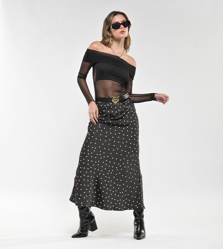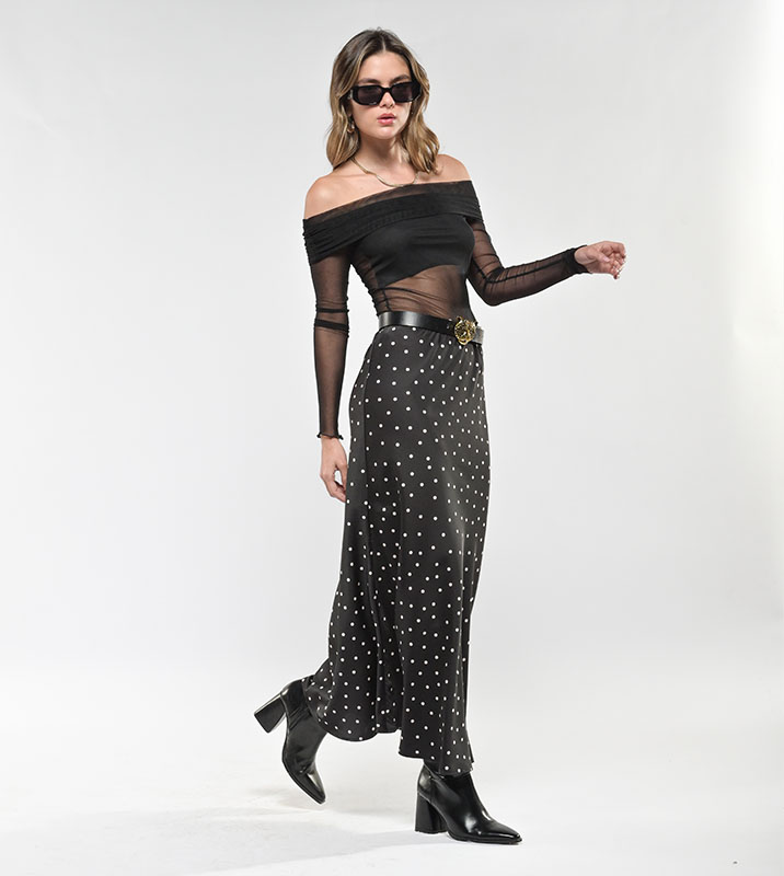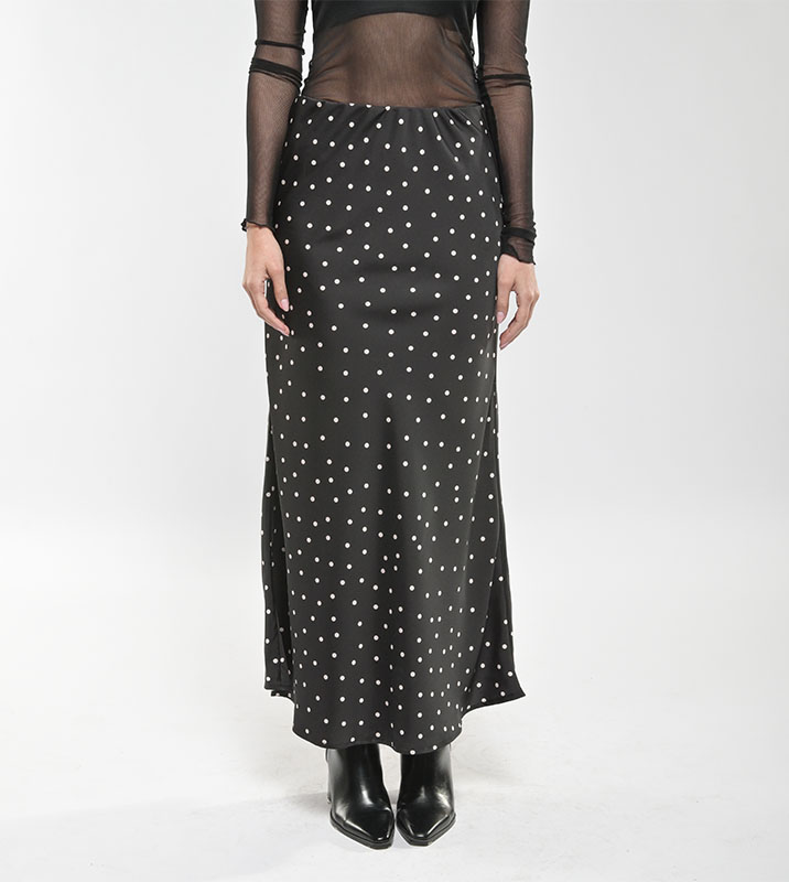 Falda Larga Seda Satín Negra Puntos
