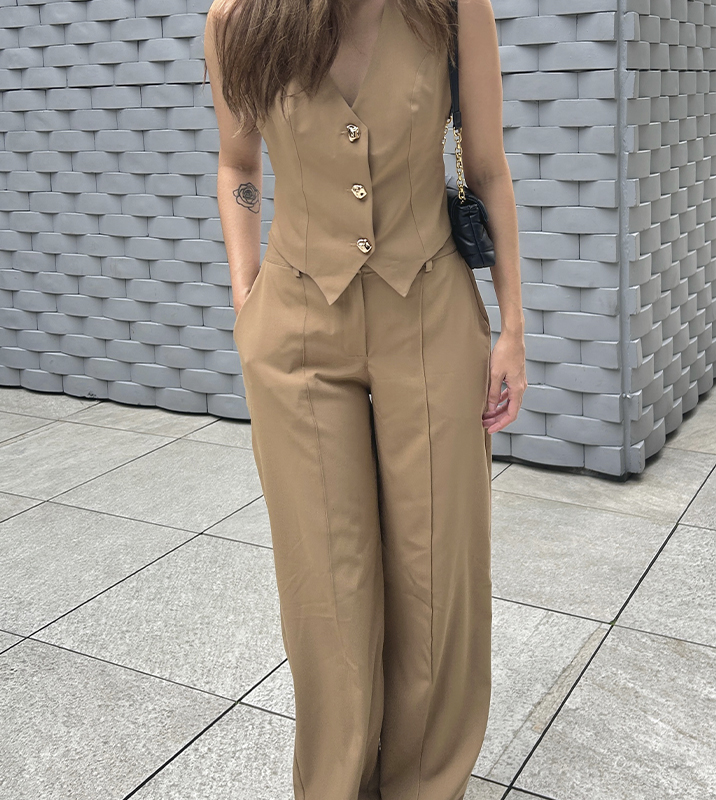 Set de chaleco y pantalón con un estilo fresco y moderno. El chaleco lleva botones dorados que le dan un toque llamativo, mientras que el pantalón es súper cómodo gracias a su pretina con caucho en la parte de atrás, bolsillos laterales, y botón frontal invisible para un look más limpio.