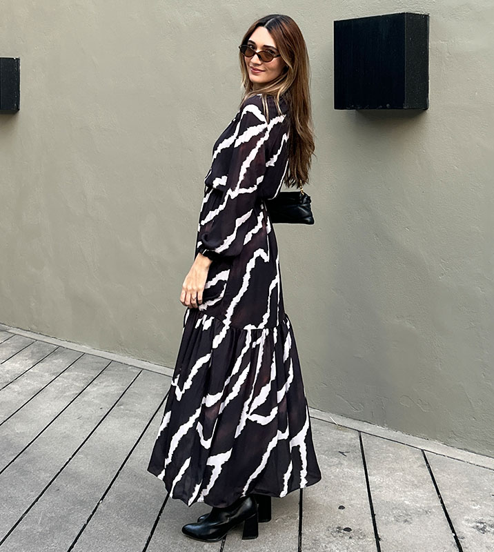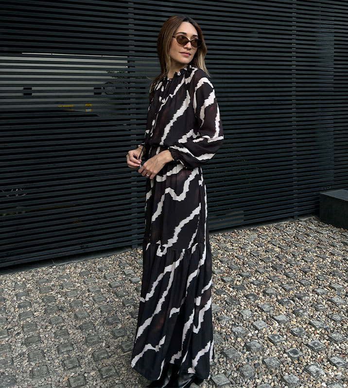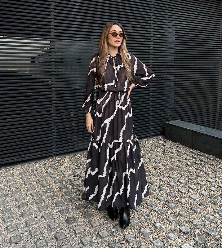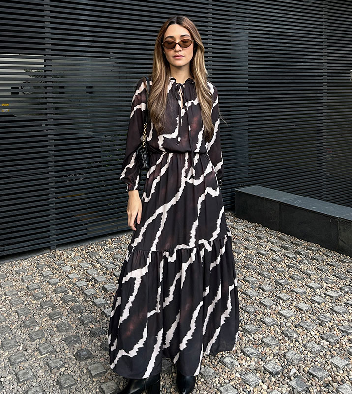Vestido largo chifón, su silueta es fluida/suelta, hecho en tela chifón, en la cintura tiene caucho para mejor ajuste, incluye forro en la falda. Una pieza moderna y sofisticada, para un look casual y versátil. Tipo de tela apta para clima frio o cálido, vestido versátil perfecto para uso formal e informal. Manufactura 100% Colombia.