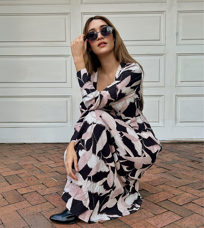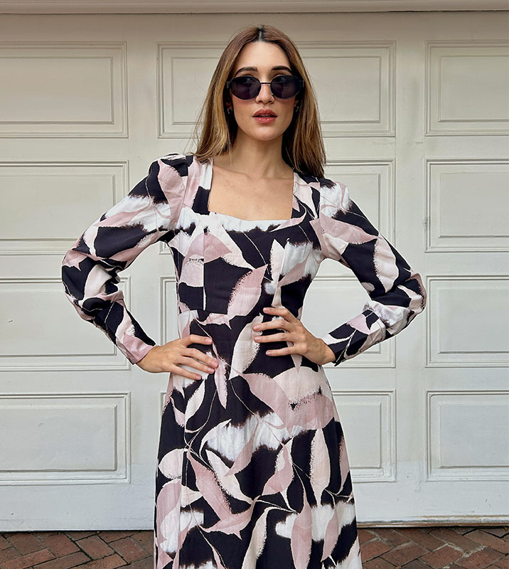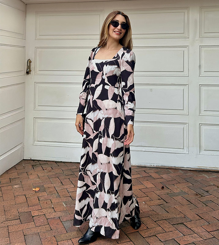 Vestido Largo en tela Rayón, escote en cuello cuadrado, manga larga con terminación en puño camisero y botones. Tiene cremallera invisible lateral. Prenda ideal para clima caliente o frío, ya que su tela es fresca y suave. Para uso formal e informal. Manufactura 100% colombiana.