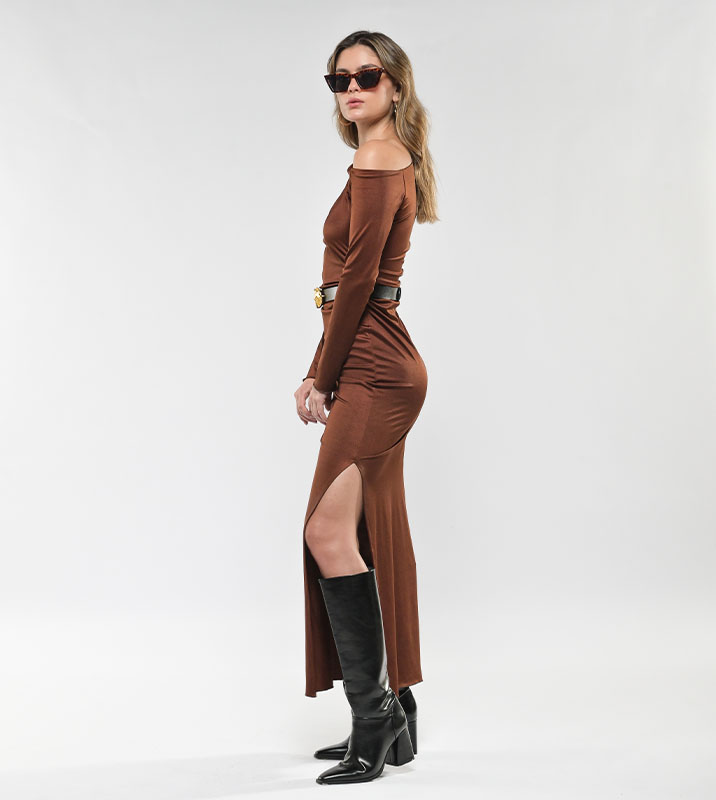Vestido Largo Hombro Caído Café