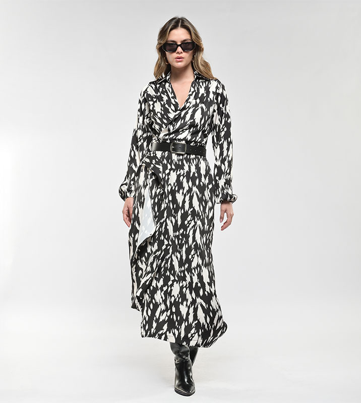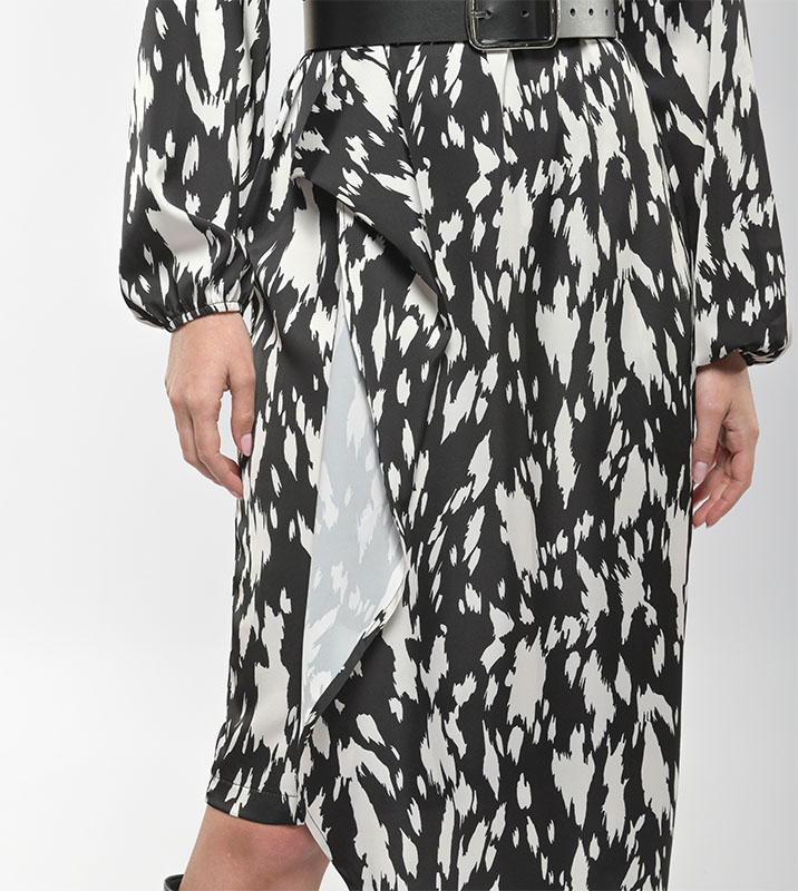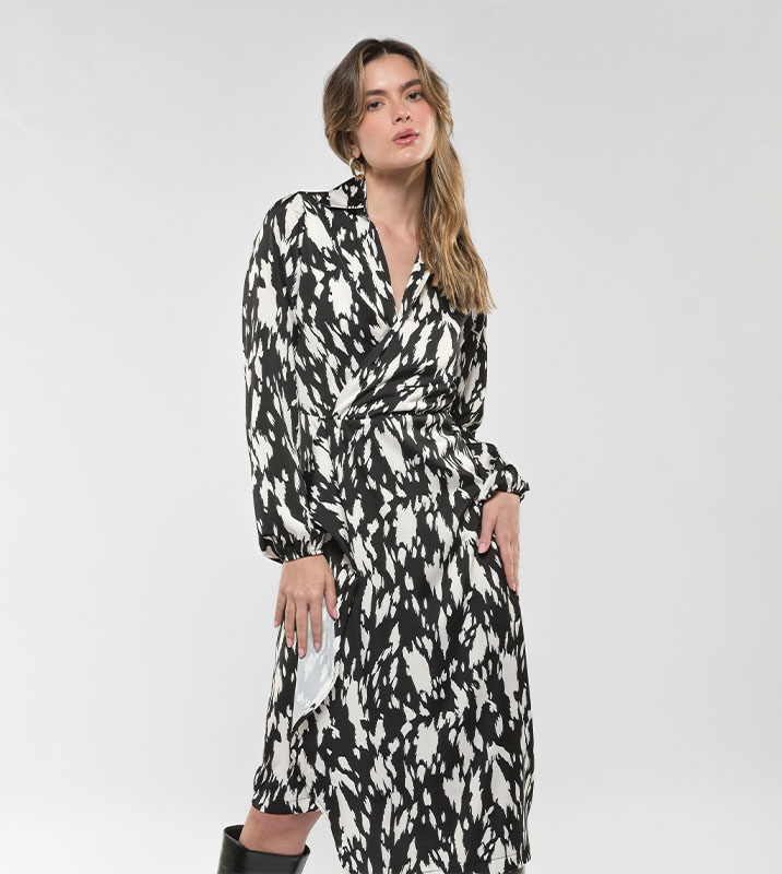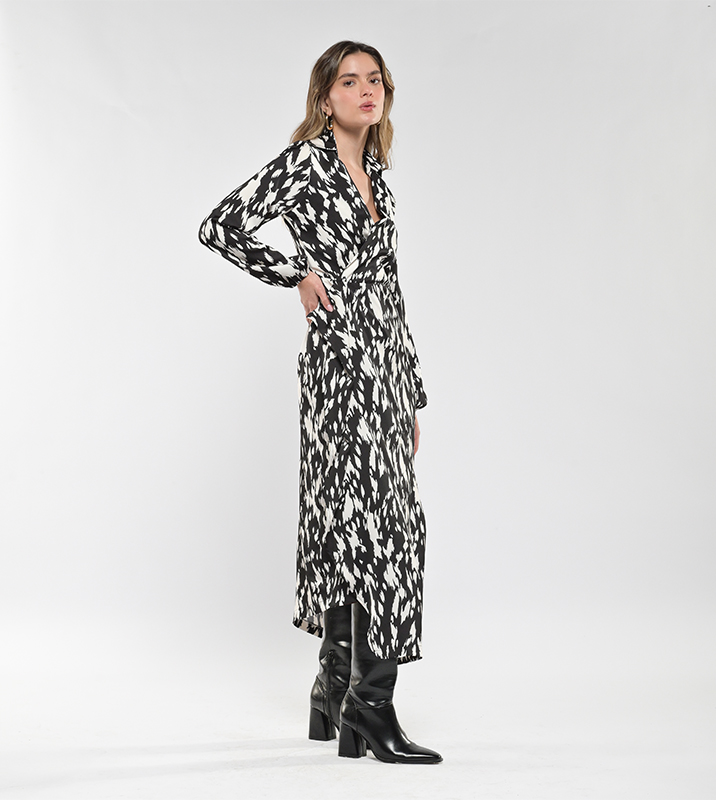 Vestido midi hecho en seda satín, manga larga y en el puño con caucho de 1 cm, destaca por su capa delantera con un bolero, la capa sobrepuesta es asimétrica. Tiene un cierre lateral para mejor ajuste, Tipo de tela apta para clima frio o cálido, vestido versátil perfecto para uso formal e informal. Manufactura 100% Colombia.