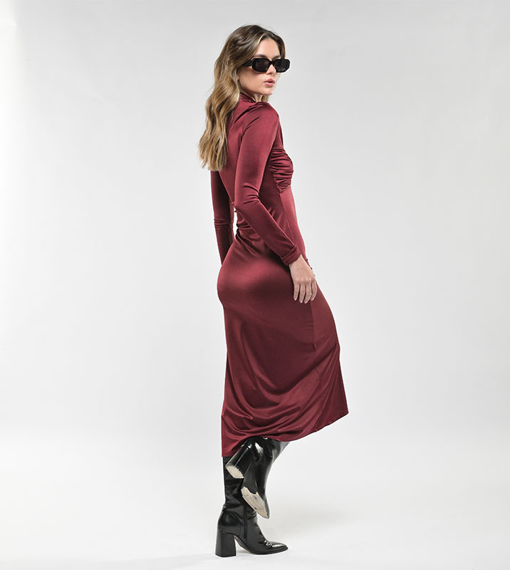 Vestido midi ajustado al cuerpo con falda semi suelta; la tela es licrada, manga larga y cuello alto. Tiene abertura lateral sobre el costado izquierdo. Como detalle tiene un drapeado sobre el pecho y el hombro derecho. Tipo de tela apta para clima frio o cálido, perfecto para uso formal e informal. Manufactura 100% Colombia.